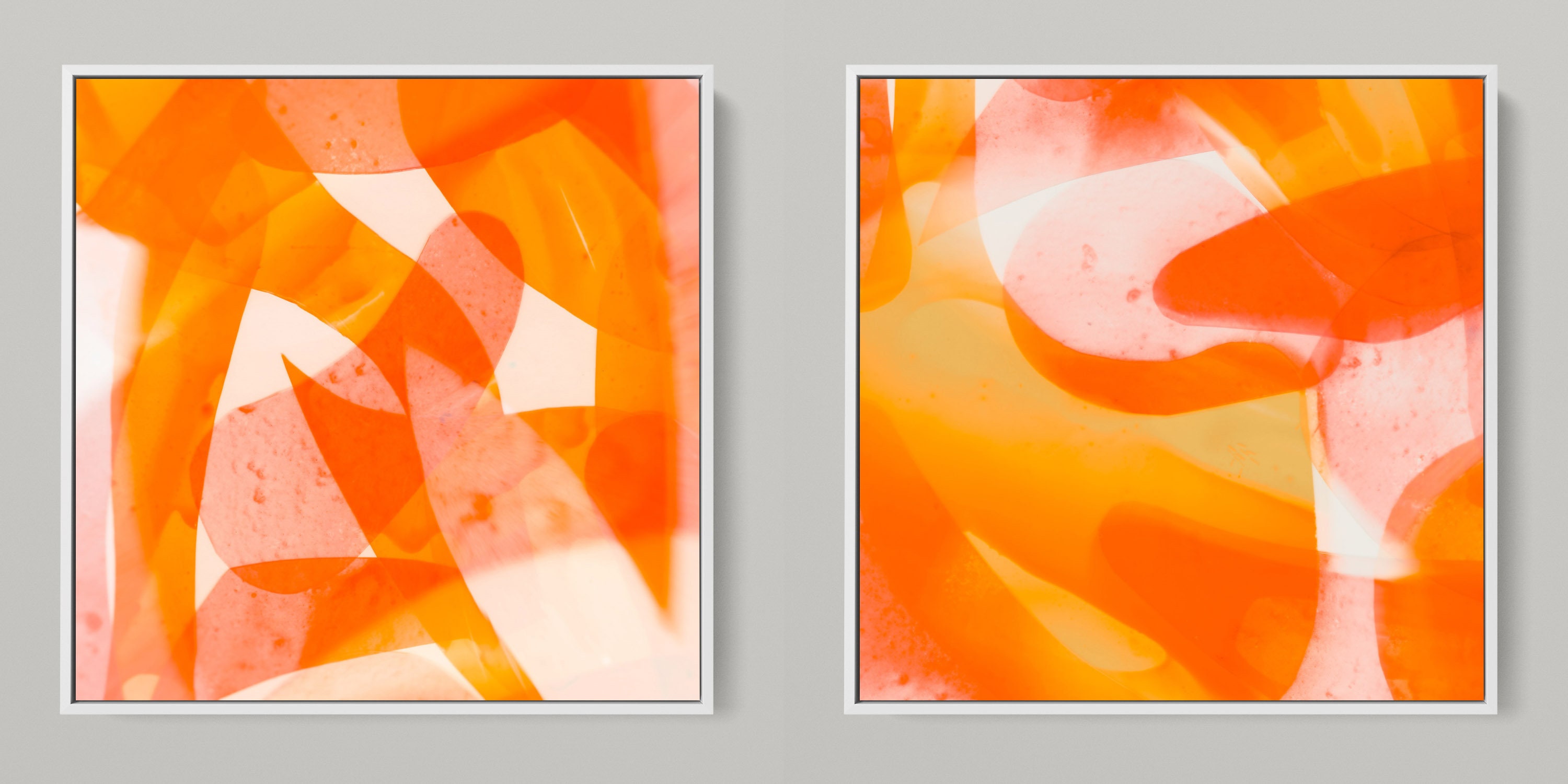 Scanography art from the abstract series by Sven Pfrommer. A diptych produced in museum quality: art on dibond, protected by a varnish and framed with a white wooden floater frame, ready to hang.